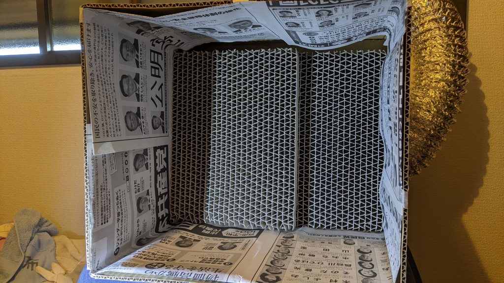 最も単純なのが組み立て式のタイプで、段ボール箱にハニカムフィルダーを置いただけのもの。