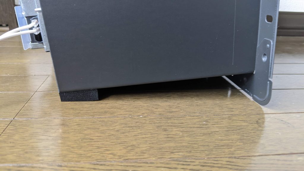 このファン、もともとは天井設置用ですから筐体の金属が結構鋭くて、そのままですとかなり床を傷つけるそうですので、底面にクッション用のスポンジを貼ってみました。(ちなみに底面に限らず大半の角部が鋭利ですから、要注意です。)