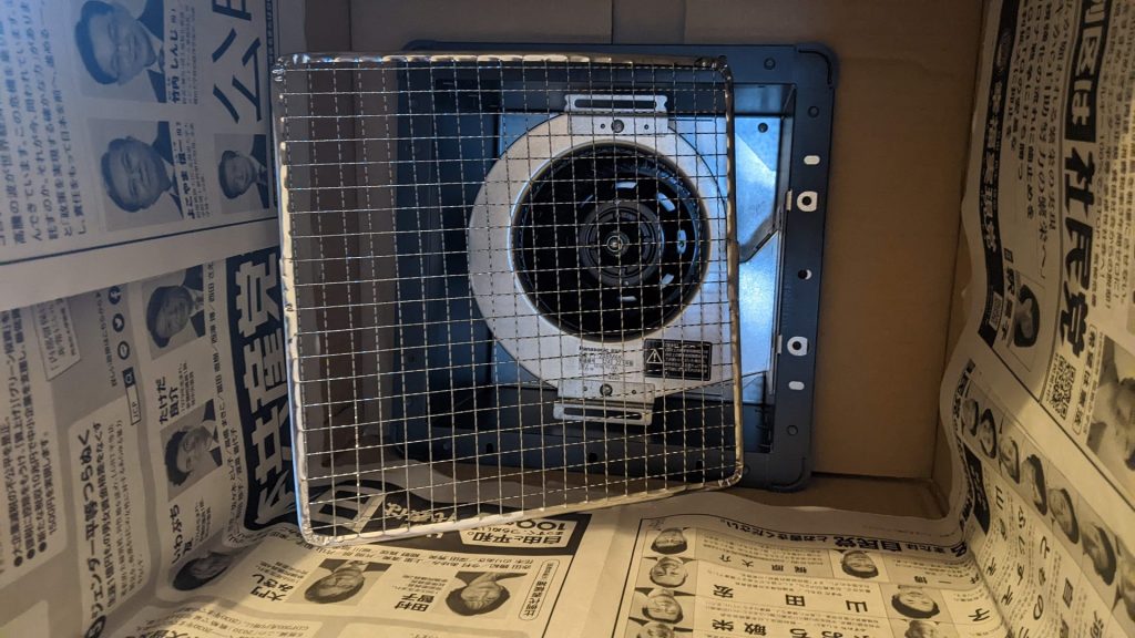 台所換気扇用の不織布フィルターをマスキングテープで貼り付け、その網をファンの縁にマスキングテープで固定。。。