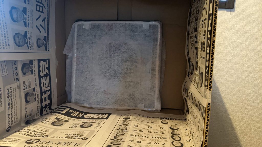 ファン全面に段ボールで箱組を作りますが、ファンそのものの重量は自立的に支えます(ようするに置くだけ)。